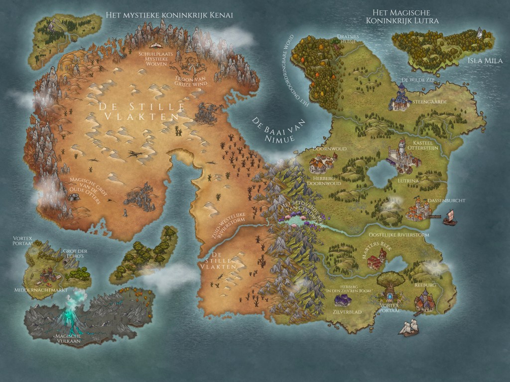 Want de magie van het boek zit hem niet alleen in de cover en het verhaal zelf, maar ook in de landkaart van het magische koninkrijk Lutra en het mystieke koninkrijk Kenai! De kaart is gemaakt door nerdographermaps en is een waar kunstwerk geworden.